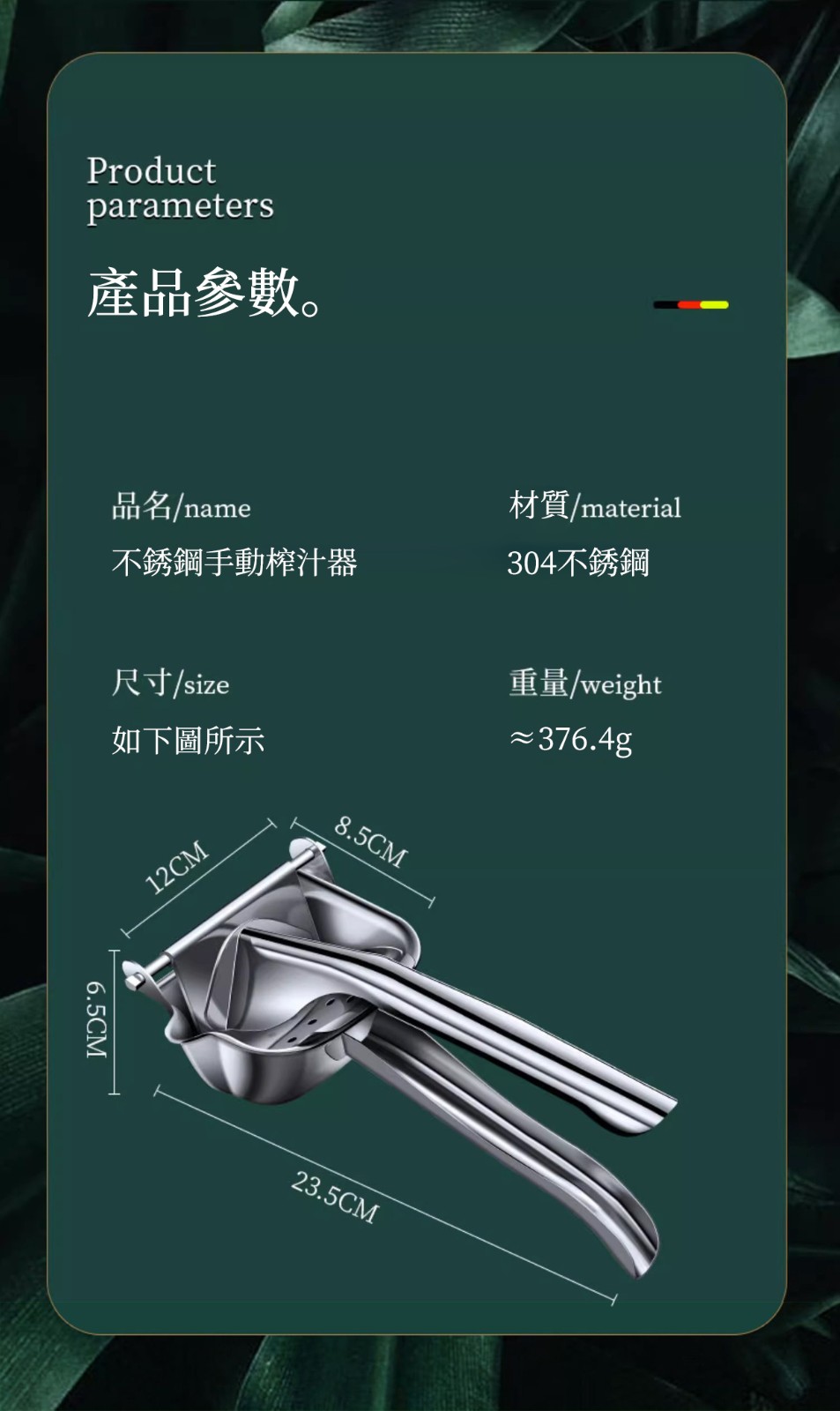 5分鐘前想喝鮮榨果汁宮又怕麻煩?304不鏽鋼手動榨汁汁來助力! 食品級材質安全耐用,鬆分離果渣與果汁,西瓜、石榴、柳丁随心榨!小巧便攜不佔地,手動按壓超解壓,新鮮健康零添加,讓你隨時隨地享原汁原味~ - 【體驗裝】1入組 NT$898