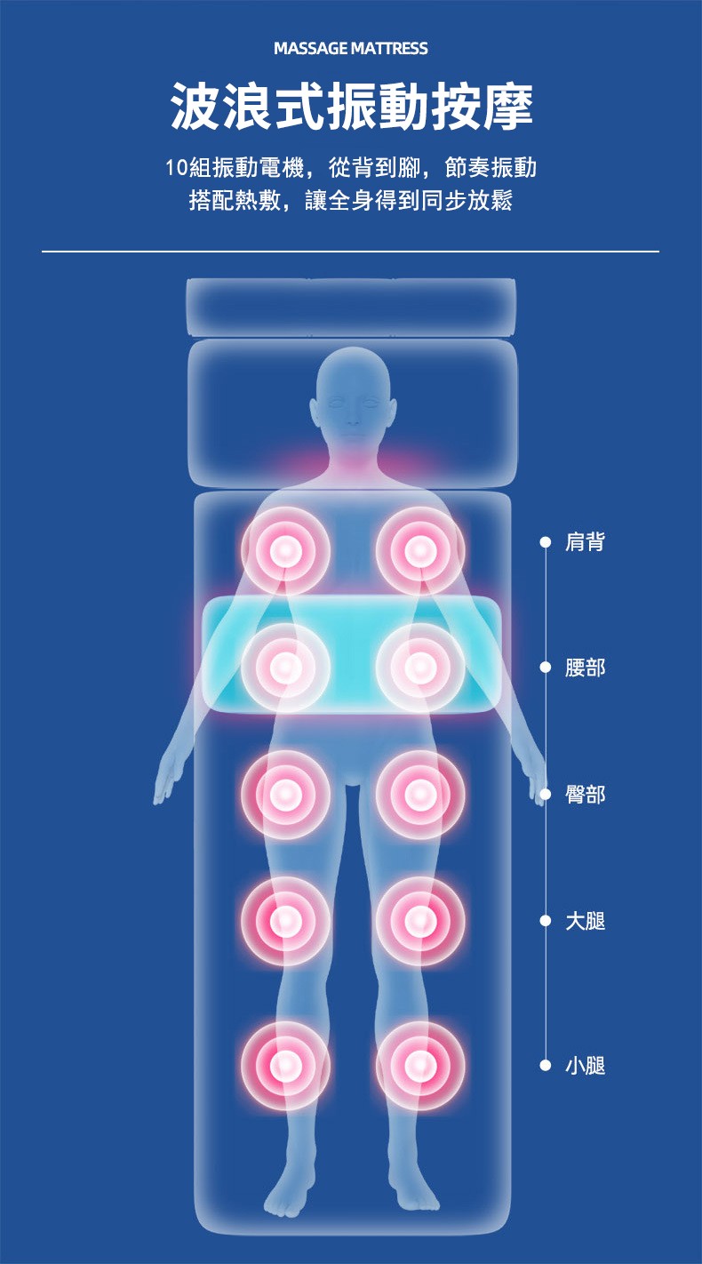 7分鐘前多功能全身按摩床墊 | 電動加熱頸椎、腰部、背部、腿部全方位按摩器,舒緩身心疲勞 - 6鍵旗艦款(6鍵揉捏+震動+氣囊+10電機+腰部熱敷)