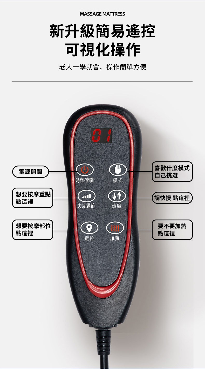 2分鐘前多功能全身按摩床墊 | 電動加熱頸椎、腰部、背部、腿部全方位按摩器,舒緩身心疲勞 - 6鍵旗艦款(6鍵揉捏+震動+氣囊+10電機+腰部熱敷)