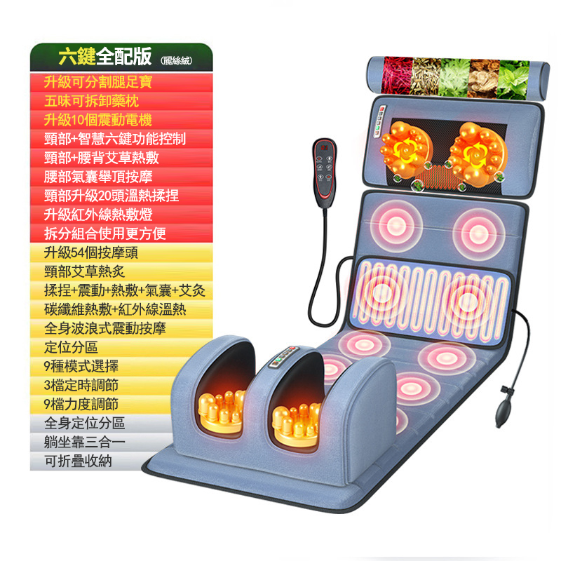 15分鐘前多功能全身按摩床墊 | 電動加熱頸椎、腰部、背部、腿部全方位按摩器,舒緩身心疲勞 - 6鍵旗艦款(6鍵揉捏+震動+氣囊+10電機+腰部熱敷)