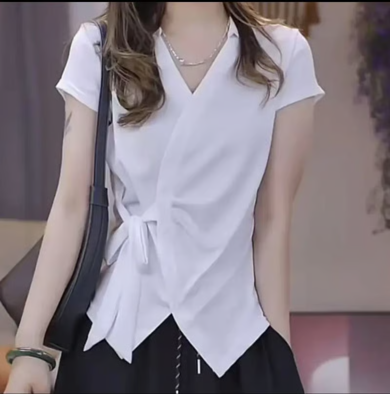 25分鐘前夏季新款重工不規則設計短袖時尚綁帶V領T恤女修身顯瘦上衣女 - 【超值團購】到手3件-NT$1699