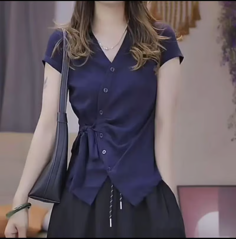 7分鐘前夏季新款重工不規則設計短袖時尚綁帶V領T恤女修身顯瘦上衣女 - 【均價699】到手2件-NT$1399
